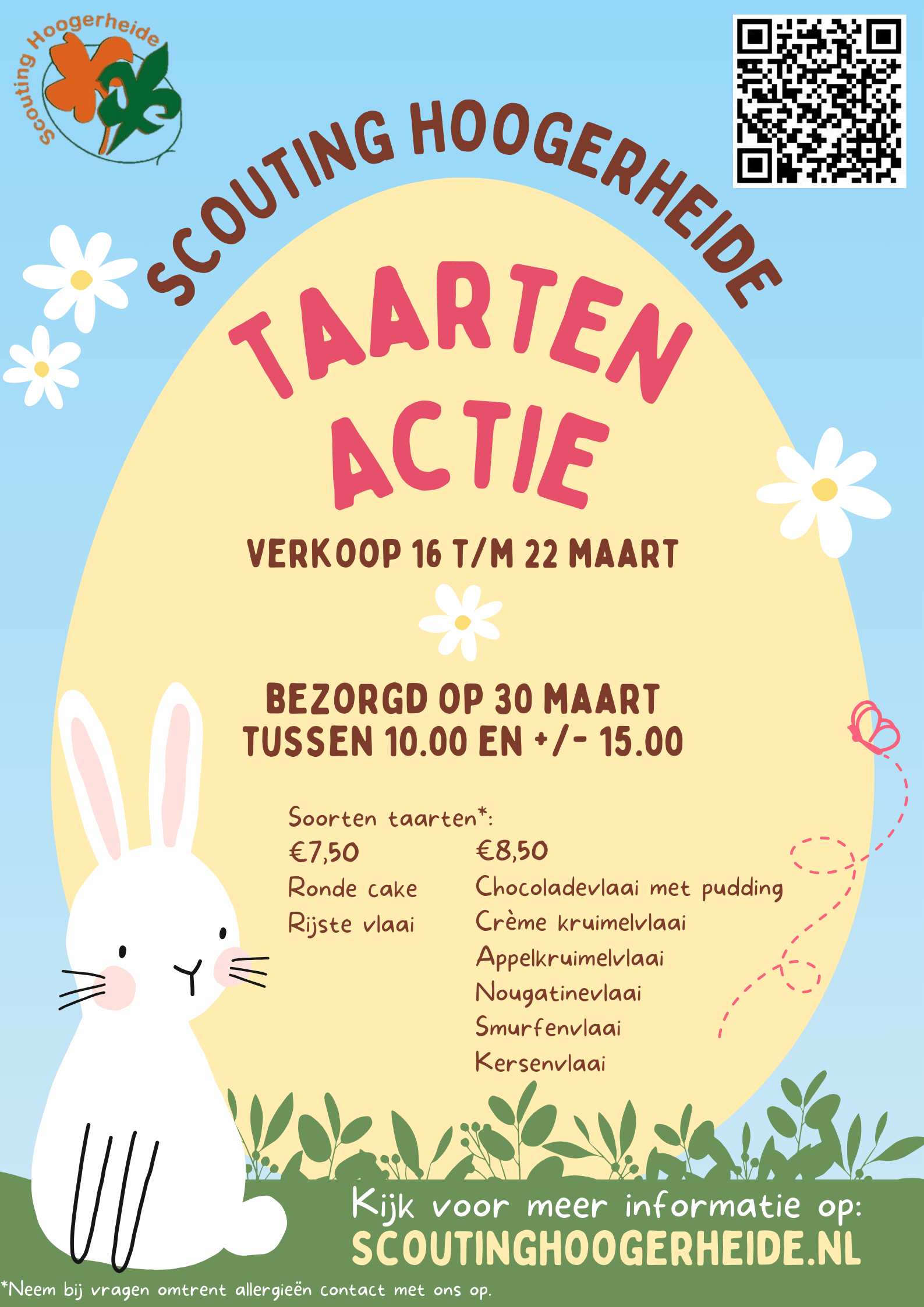 Daarnaast gaan de jeugdleden van de bevers, welpen jongens en meisjes, scouts jongens en meiden en de pivo's die dag starten met de verkoop van taarten. Zij komen vanaf 9:30 uur op verschillende plaatsen in Hoogerheide en Woensdrecht langs de deuren. De hele week nog kunnen de leden de taarten verkopen, die bezorgd worden op 30 maart, de dag voor Pasen.